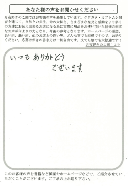 飼育情報TOP > おハガキ > ご意見・ご感想区分 > 対応 > 兵庫県 越智 様