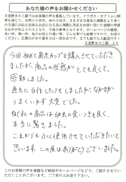 今回初めて菌糸カップを購入させていただきましたが、商品の状態がとても良くて感動しました。過去に自作したりもしましたが、なかなかうまくいかず大変でした。御社の商品は幼虫の食いつきも良く、本当に驚きました。これからも永く使用させていただきたいと思います。この度はありがとうございました。