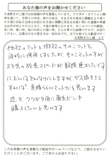 他社のマットを御社のきのこマットを同時に使用しましたが、きのこマットの方が幼虫の成長スピードが数段速かったです。においはそれなりにしますが、ガス抜きさえすれば素晴らしいマットだと思います。近々クワガタ用に菌糸ビンも購入したいと思います。