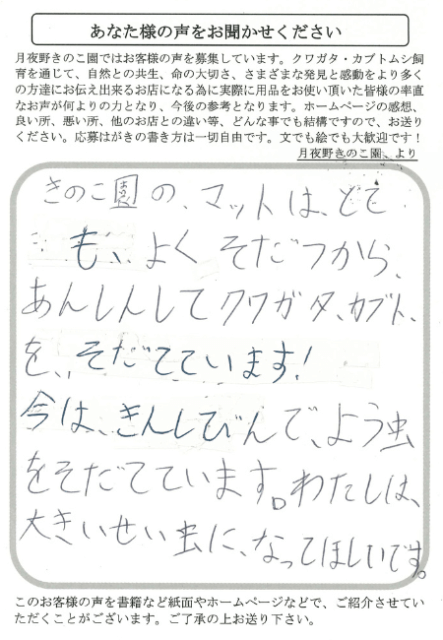 きのこ園のマットは、とてもよくそだつから、あんしんしてクワガタ・カブトをそだてています!今は、きんしびんでよう虫をそだてています。わたしは大きいせい虫になってほしいです。