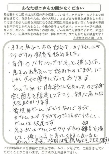 ・YouTubeで月夜野さんを知ったのですが安く菌糸を販売して下さり、初心者には大変助かります。