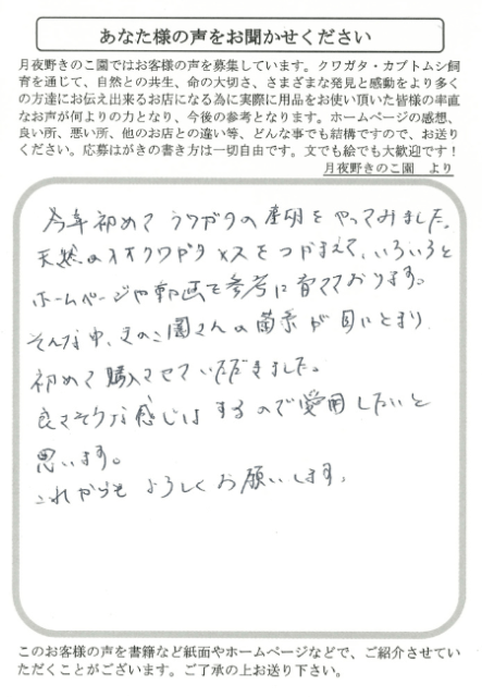 今年初めてクワガタの産卵をやってみました。天然のオオクワガタメスをつかまえて、いろいろとホームページや動画を参考に育てております。そんな中、きのこ園さんの菌糸が目にとまり初めて購入させていただきました。良さそうな感じはするので愛用したいと思います。これからもよろしくお願いします。