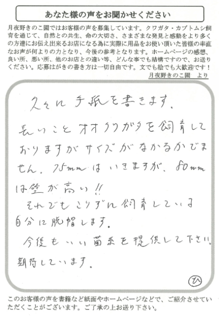 久々に手紙を書きます。長いことオオクワガタを飼育しておりますがサイズがなかなかでません。75mmはいきますが、80mmは壁が高い!!それでもこりずに飼育している自分に脱帽します。今後もいい菌糸を提案して下さい。期待しています。