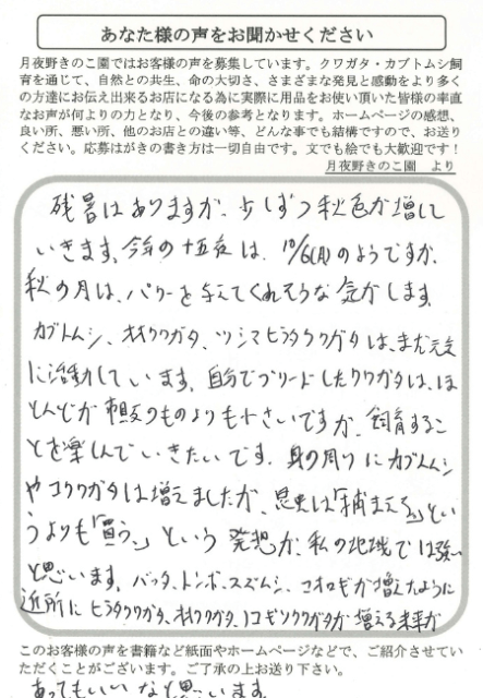 残暑はありますが、少しずつ秋色が増していきます。今年の十五夜は10/6(月)のようですが、秋の月はパワーを与えてくれそうな気がします。カブトムシ・オオクワガタ・ツシマヒラタクワガタは、まだ元気に活動しています。自分でブリードしたクワガタは、ほとんどが市販のものよりも小さいですが、飼育することを楽しんでいくたいです。身の周りにカブトムシやコクワガタは増えましたが、昆虫は「捕まえる」というより「買う」という発想が私の地域では強いと思います。バッタ・トンボ・スズムシ・コオロギが増えたように近所にヒラタクワガタ・オオクワガタ・ノコギリクワガタが増える未来があってもいいなと思います・。