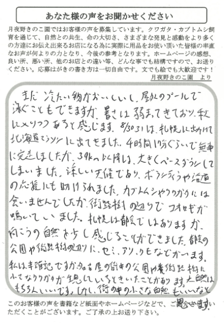 まだ冷たい物がおいしいし、屋外のプールで泳ぐこともできますが、暑さは弱まってきており、秋に入りつつあると感じます。8/30・31は札幌に出かけて北海道マラソンに出てきました。4時間17分ぐらいで無事に完走しましたが、39km以降は大きくペースダウンしてしまいました。涼しい天候であり、ボランティアや沿道の応援にも助けられました。カブトムシやクワガタには会いませんでしたが、街路樹の辺りでコウロギが鳴いていました。札幌は都会ではありますが、向こうの自然を少し感じることができました。都会の公園や街路樹の辺りに、セミ・アリ・クモなどがいます。私は未確認ですが名古屋の街中の公園や街路樹に小さなクワガタが生息しているときいたことがあります。大自然はもちろんいいです。しかし街の中の小さな自然もいいなと思います。