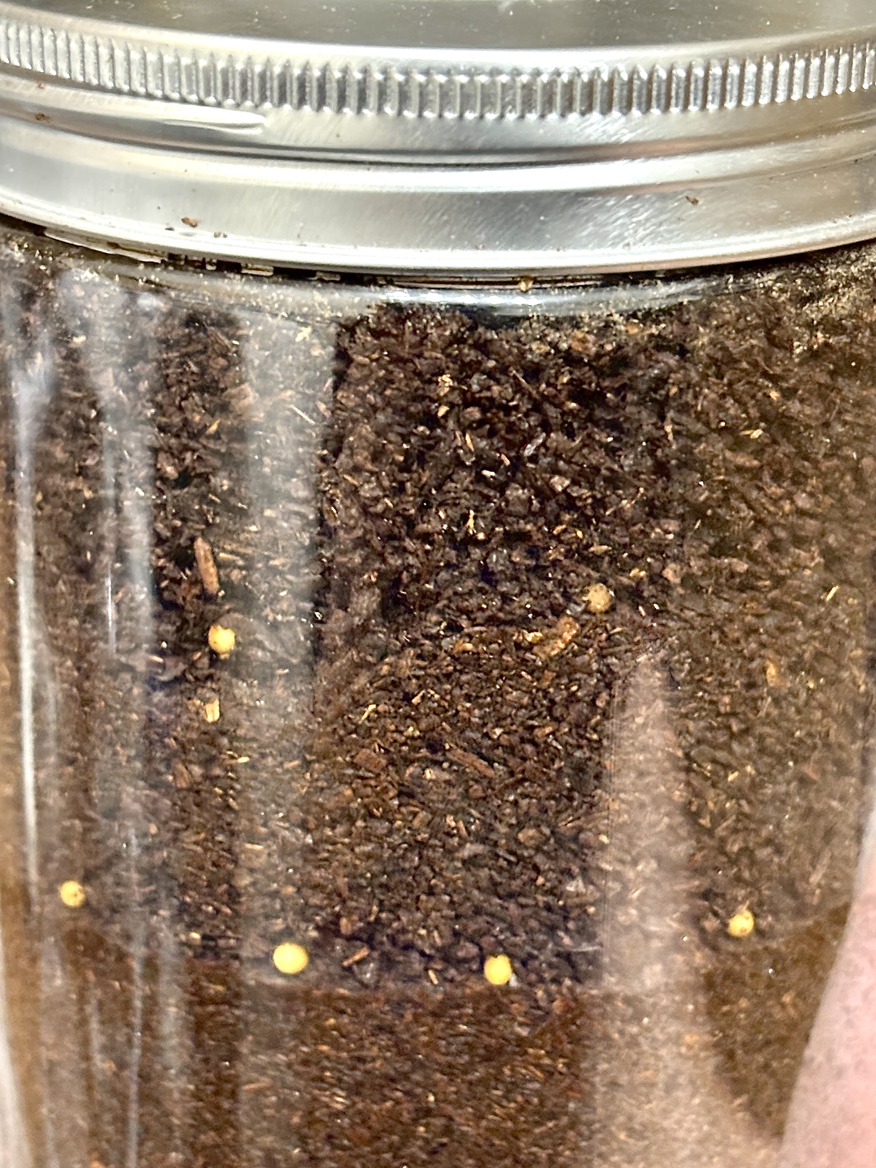 コバエシャッター小にガス抜き済みで加水したきのこMatを7割の高さまで固詰め。樹皮を散らし、マット中央に錐で穿孔誘導孔を掘って材無し。